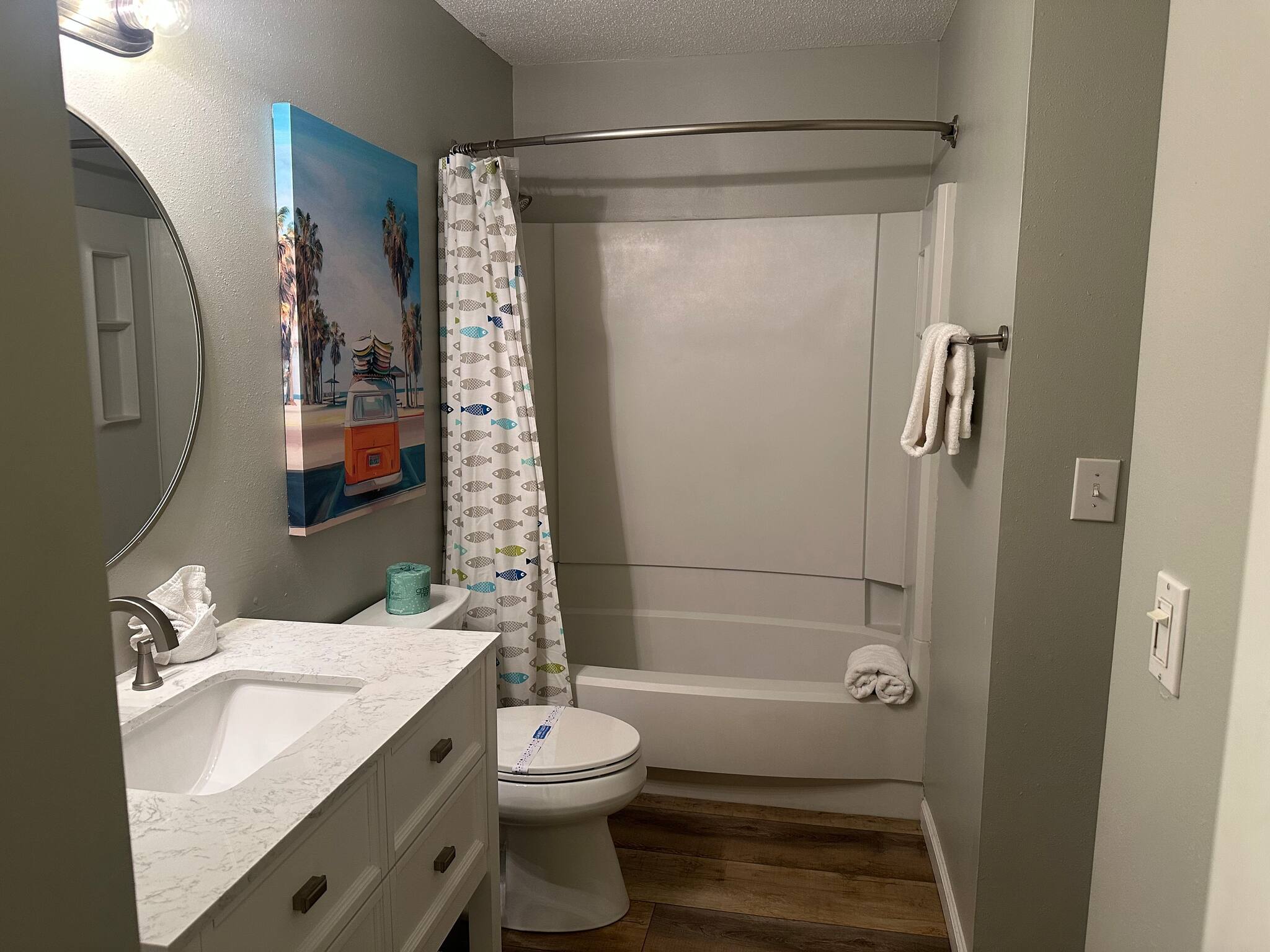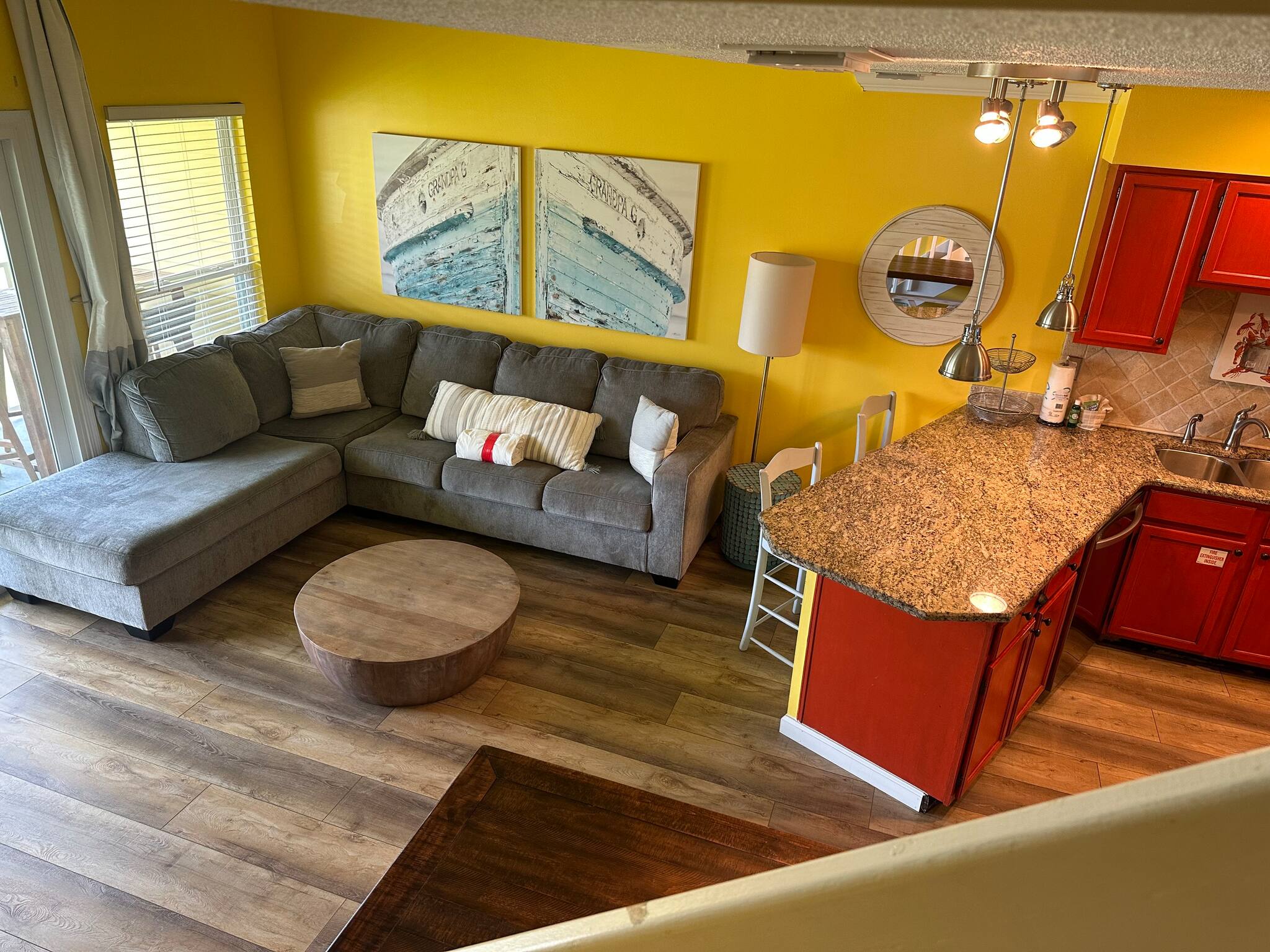 The open kitchen/living room is brightly decorated with new cupboards and white quartz countertops and is fully stocked for those wanting to prepare their meals, including a Keurig coffee maker.