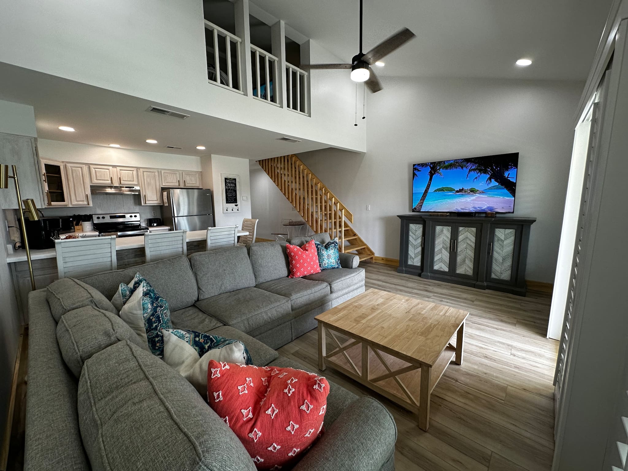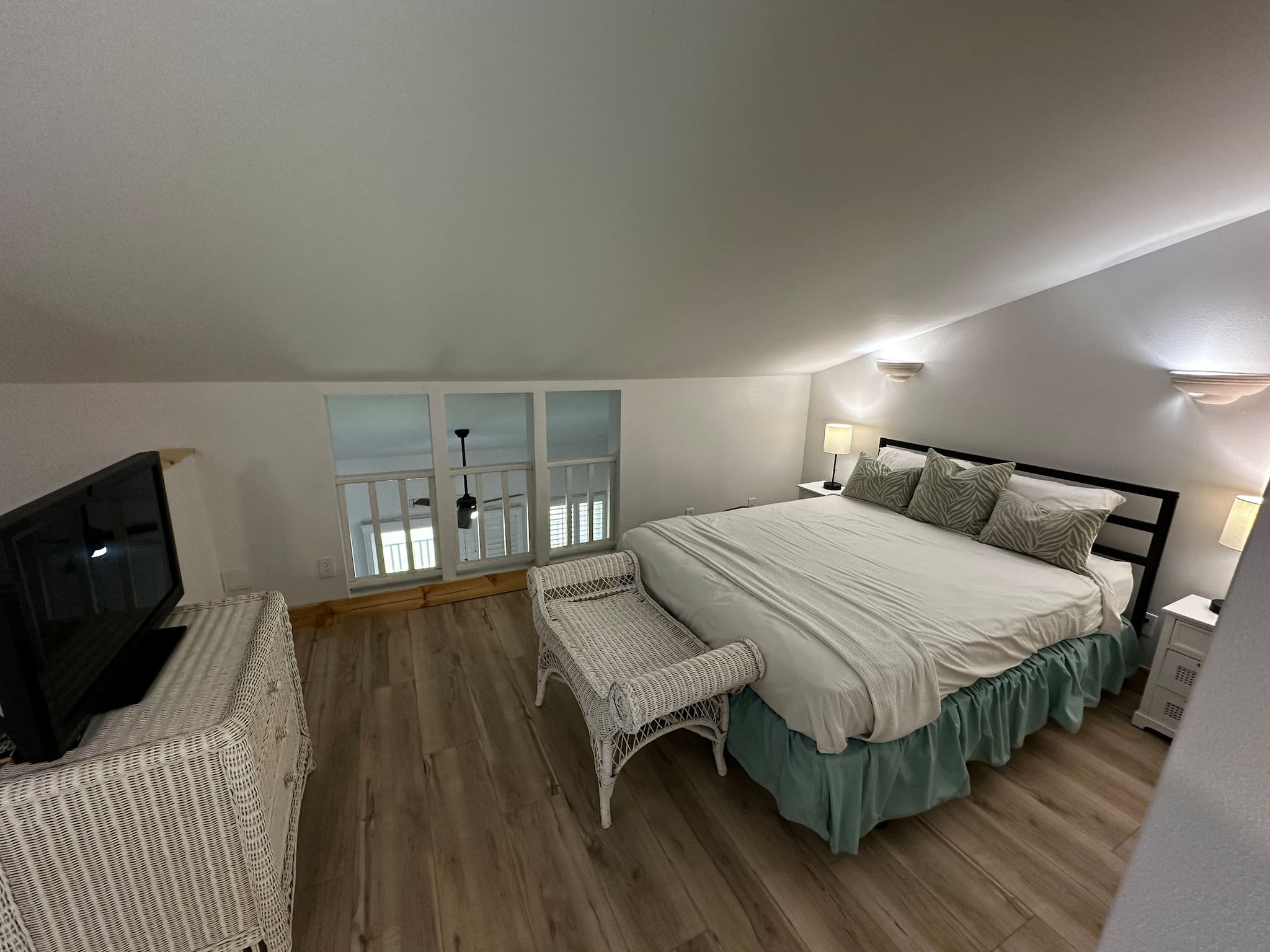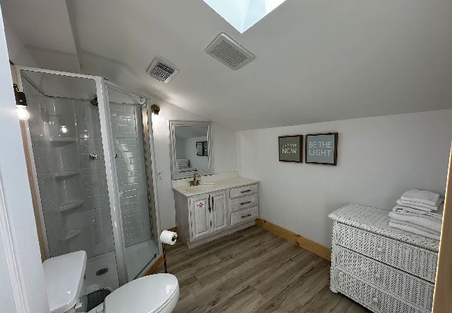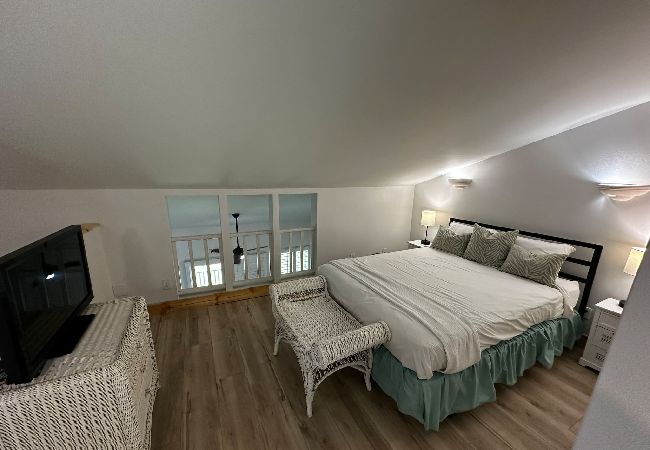 The upstairs loft is furnished with both a king-size and full-size bed in addition to a second full bath.