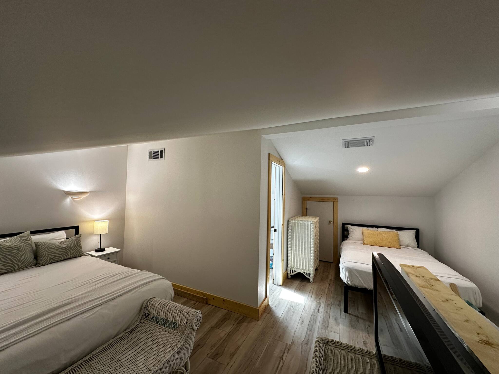 An upstairs loft with a queen + full bed