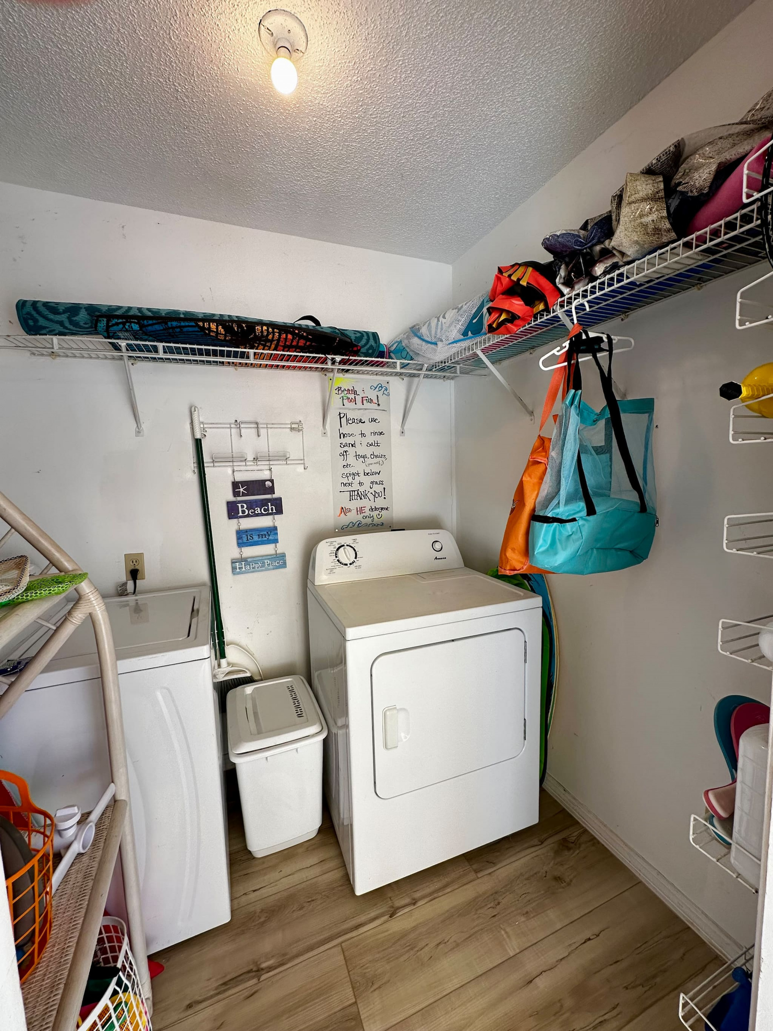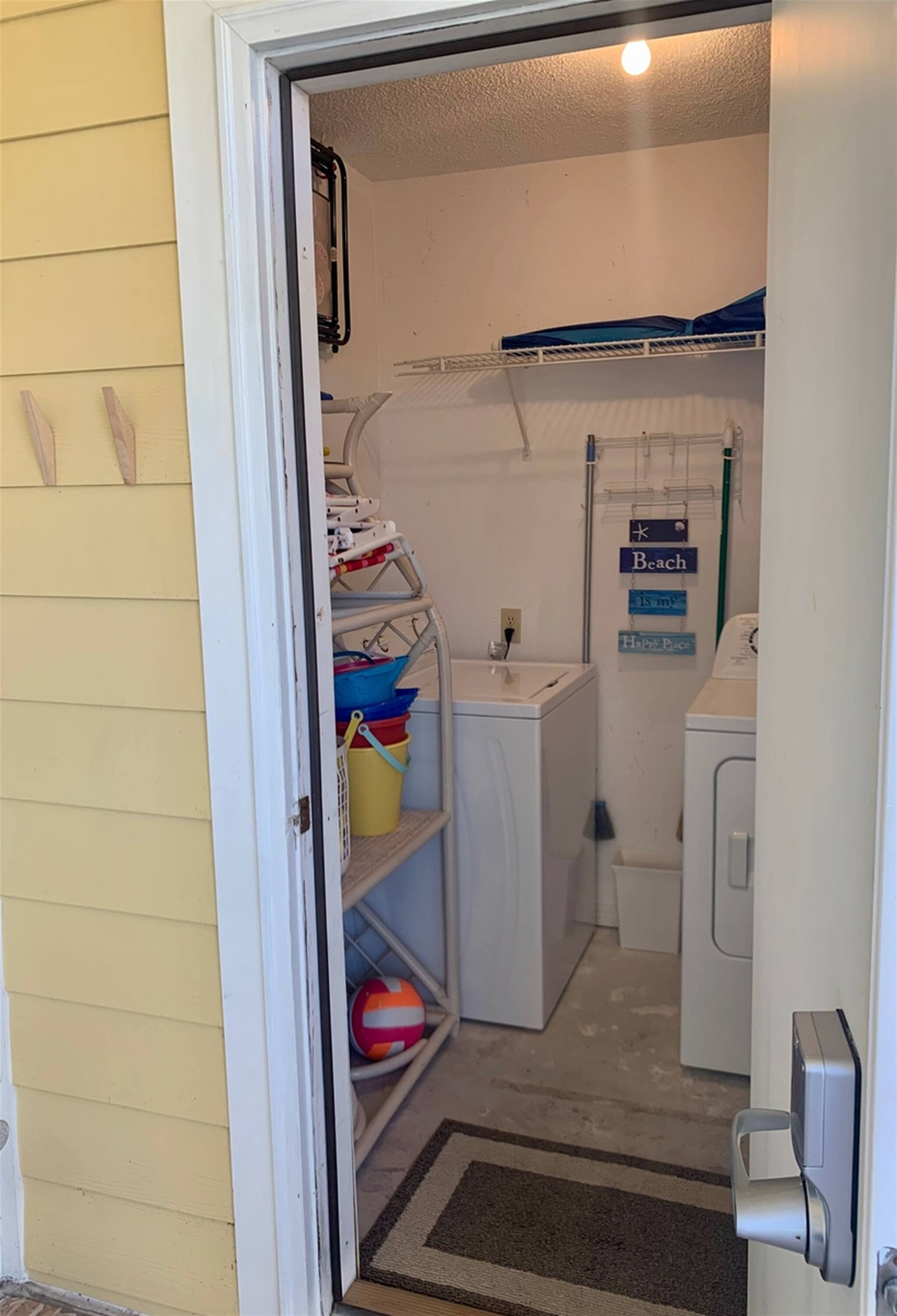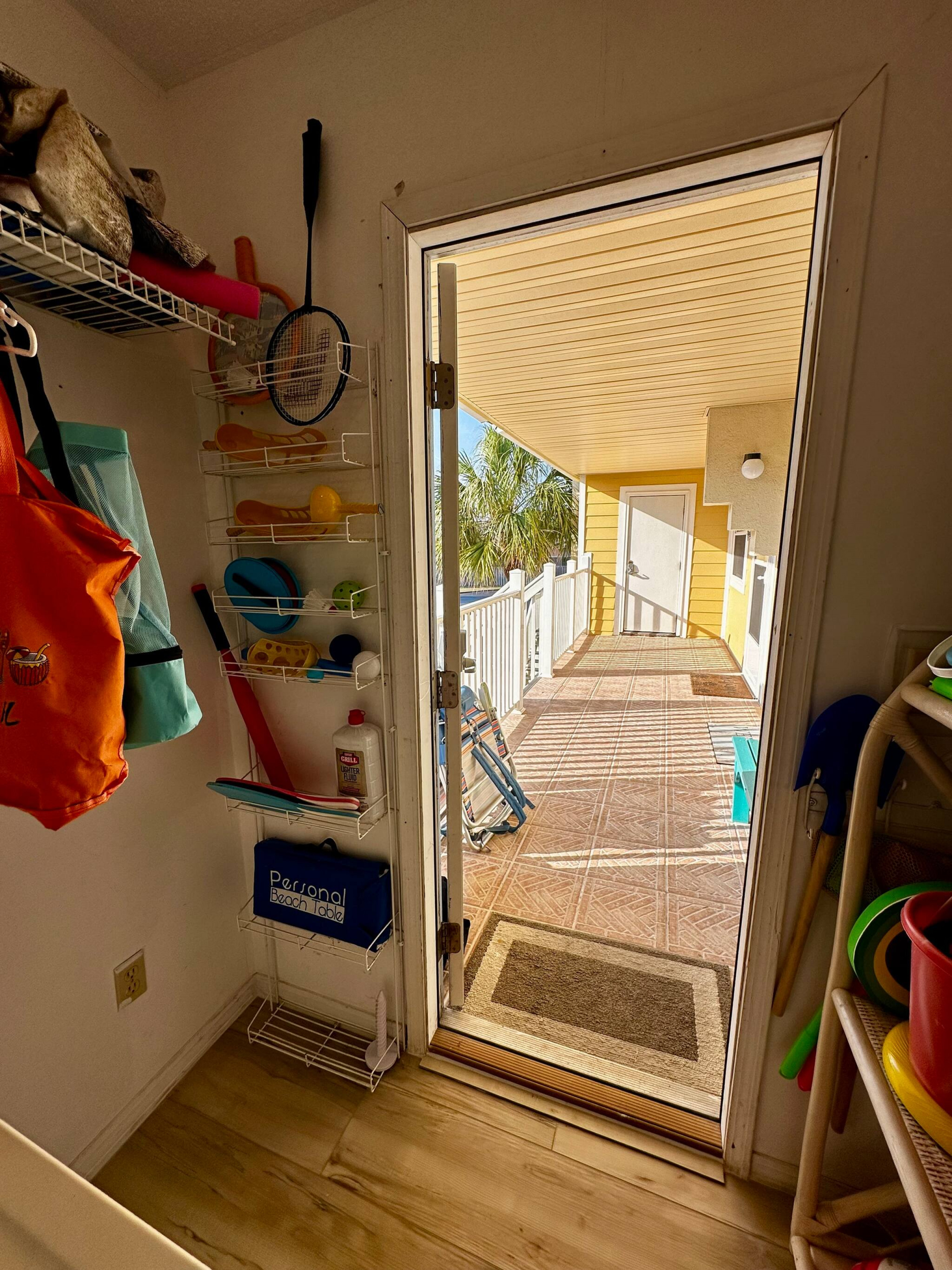 A laundry room (on the front balcony!) with some basic beach gear ready to go
