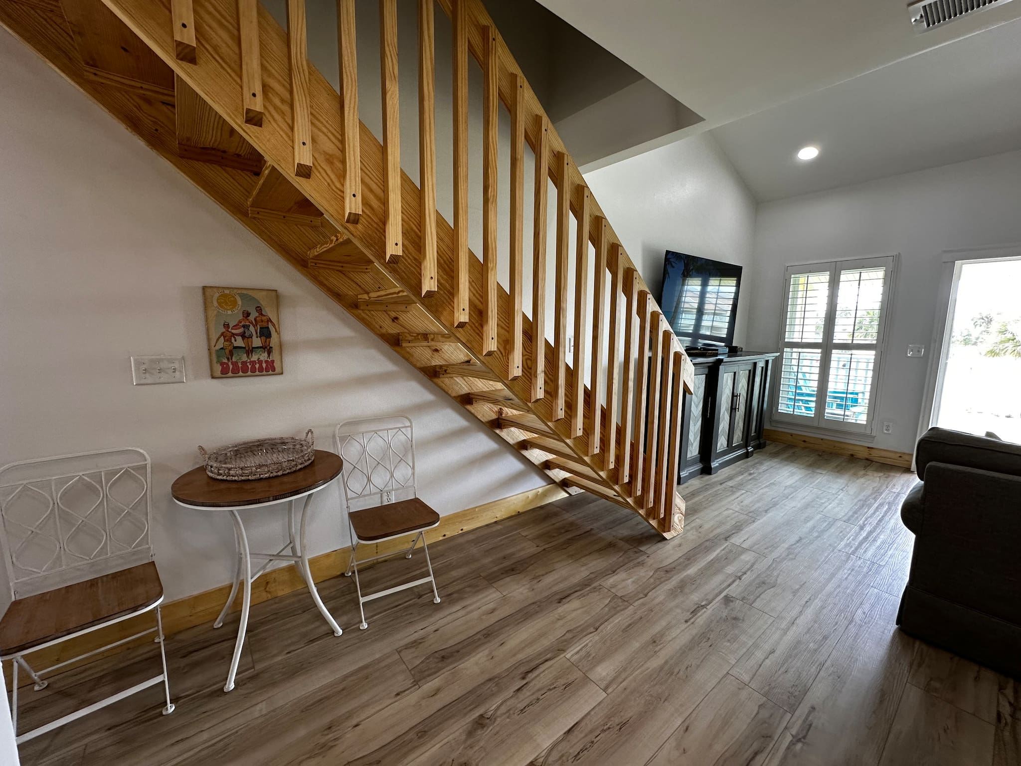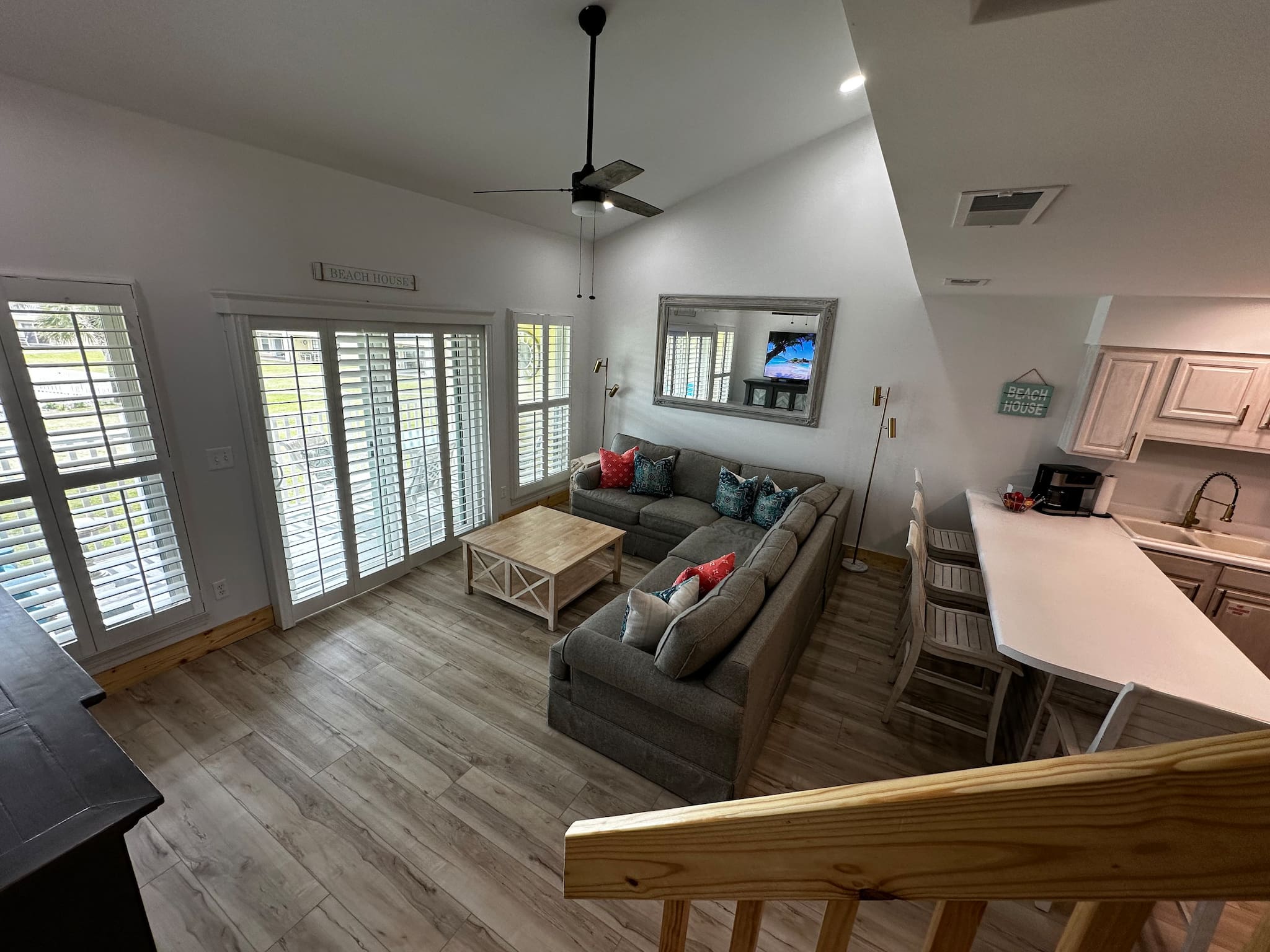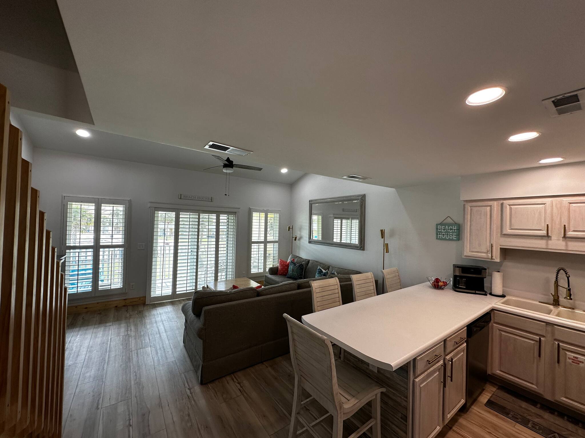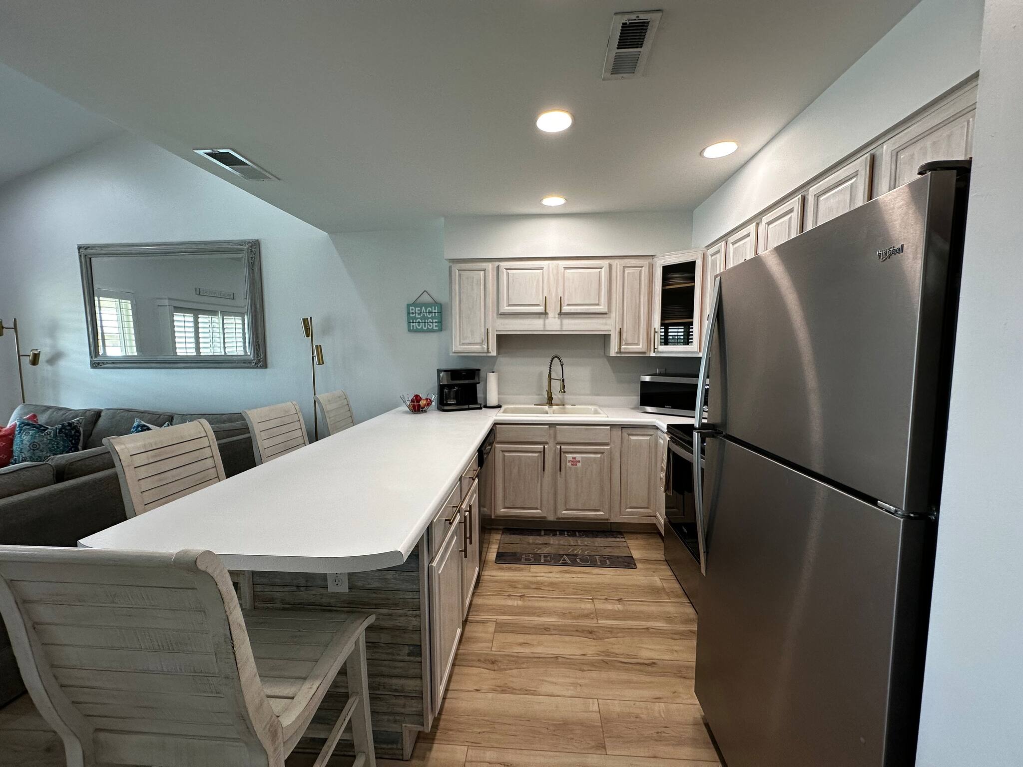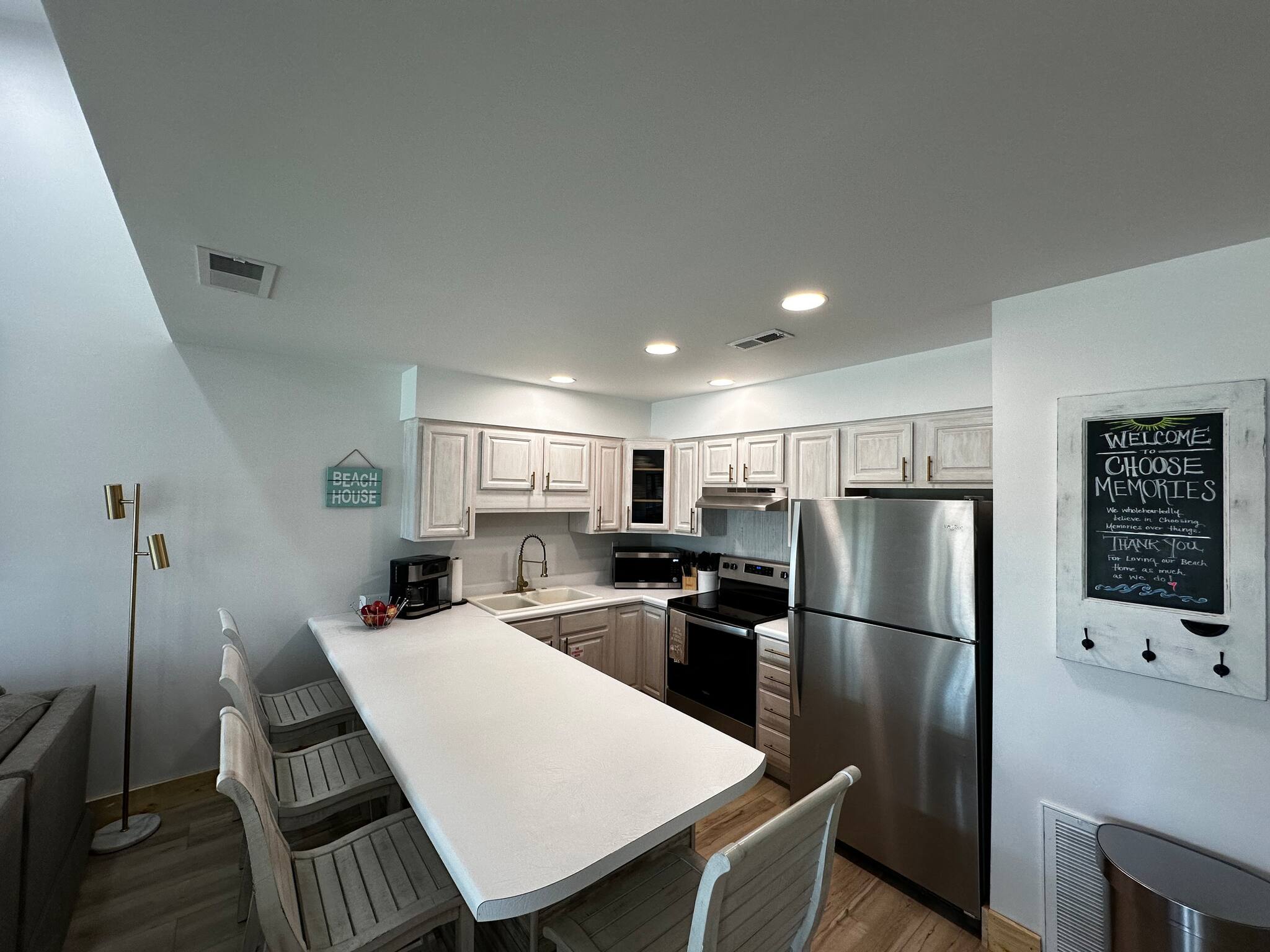 The open kitchen/living room is brightly decorated with new cupboards and white quartz countertops and is fully stocked for those wanting to prepare their meals, including a Keurig coffee maker.