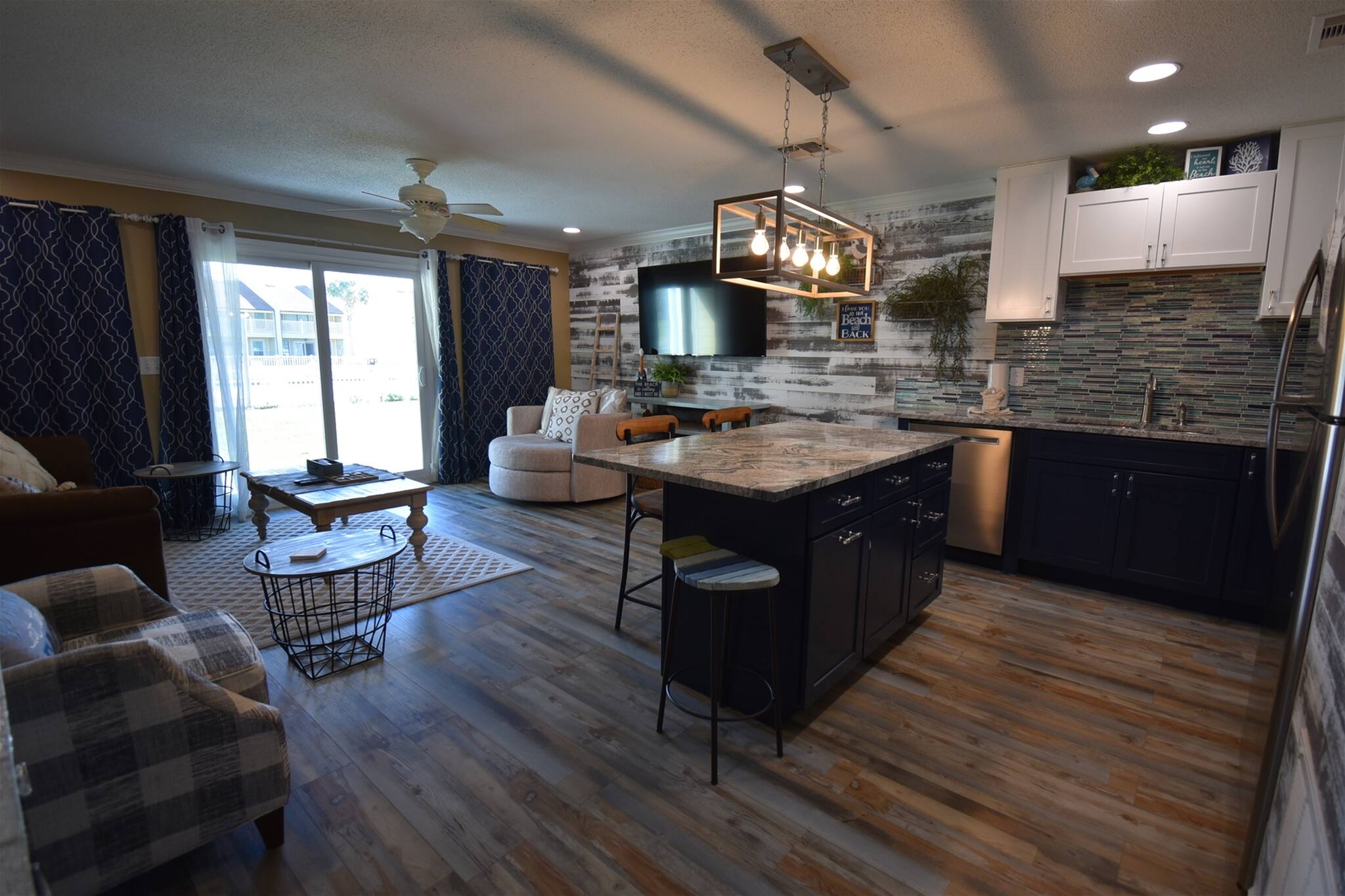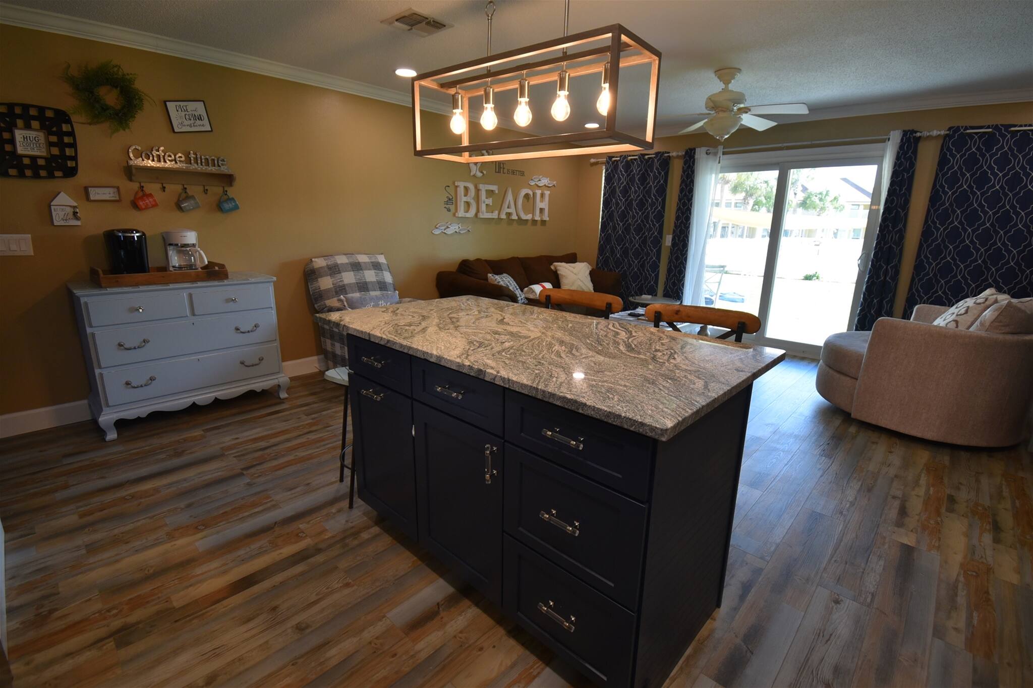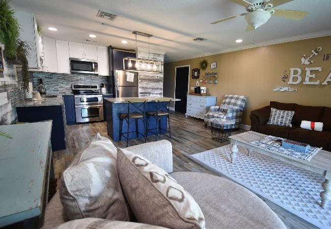 “Welcome to Settle on the Sand! With 300 feet to the sugary, white sands of Miramar Beach, your vacation home away from home awaits your arrival! Upgrades include all new stainless steel kitchen appliances including a double oven. Kitchen cabinets are fully stocked with all brand new small appliances, new formal and informal dinnerware, new chef-quality pots and pans, all new bakeware, and new cooking/baking utensils. Enjoy a wonderful beverage/wine bar for making coffee, tea, smoothies, or any adult beverage of your choice. Luxury vinyl plank flooring throughout. Main room features a 70" Smart TV, bedroom 43" Smart TV. All brand new furniture including a Cozy Sleep Queen size sofa sleeper. Mattress inside is a very comfortable 8” plush top mattress. Master bedroom has a brand new luxury king sized mattress. Laundry room includes a full sized washer and dryer as well as beach chairs and beach toys. We know you will enjoy our little piece of paradise as much as we do! Again....Welcome to Settle on the Sand!”