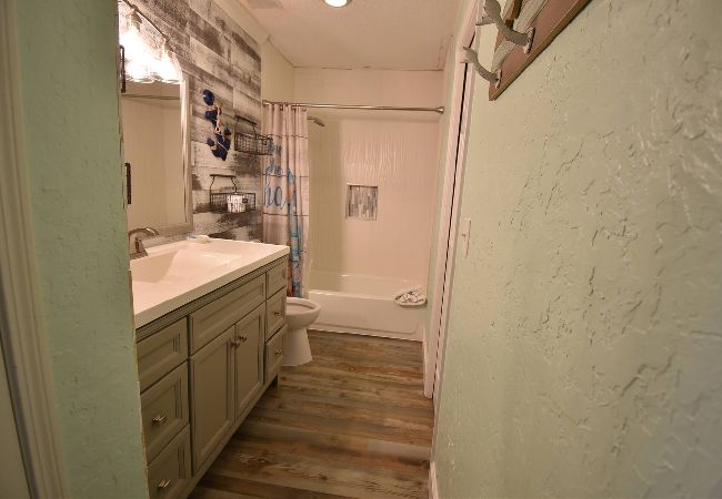 The charming and open 9B vacation condo in Destin offers its guests a first floor unit with one bedroom and a private bath. The condo can sleep six with a King-sized bed in the master bedroom, a Queen-sized sleeper sofa in the main room, and bunk beds in the hall. Make use of the fully-equipped, well stocked kitchen with its stove, microwave, fridge, and dishwasher. The kitchen has seating at the bar and a table for four. The unit is tastefully decorated with modern décor and appliances, including a washer and dryer. There are plenty of hooks for hanging wet beach towels and bathing suits to dry. Lots of detail has been put into this unit to make sure you have a comfortable stay. Connect to the complimentary wireless Internet or catch up on shows with the cable HDTVs in the main room and bedroom. The condo has a private and furnished patio that overlooks the courtyard and the seasonally heated pool as well as two reserved parking spaces. All of our units at Seacove are smoke-free and pet-free and offer unparalleled amenities with our pool, proximity to restaurants, grocery stores, and shops, and our own private beach access. Book 9B for your Destin vacation! -
