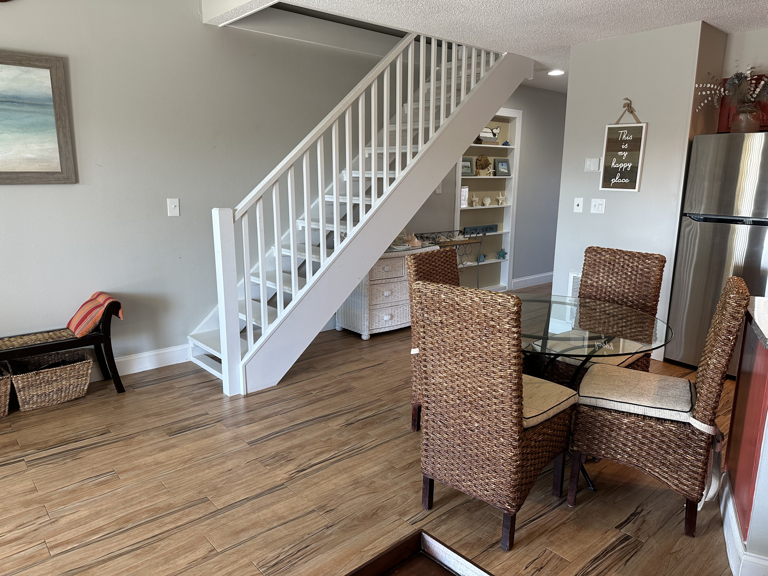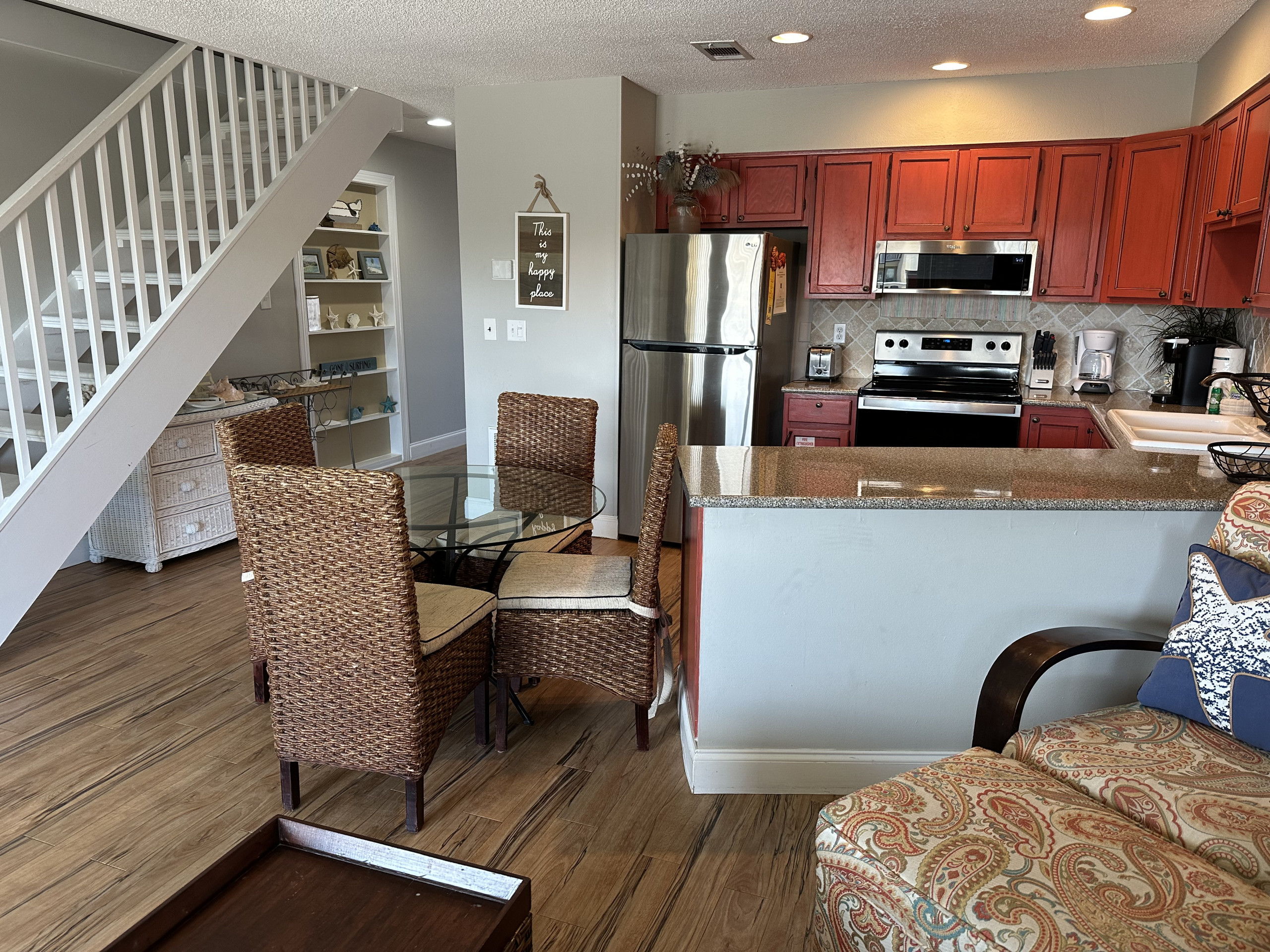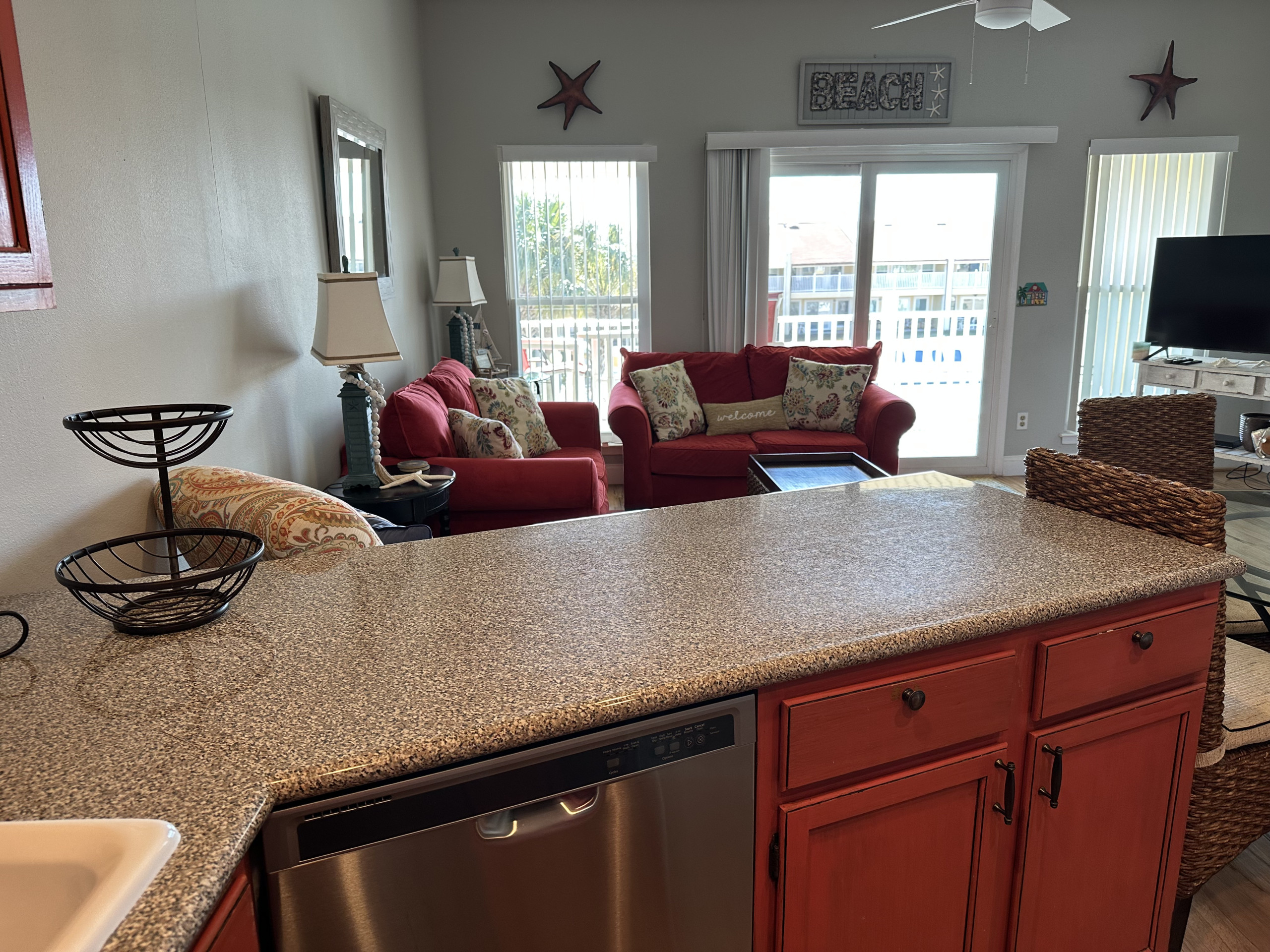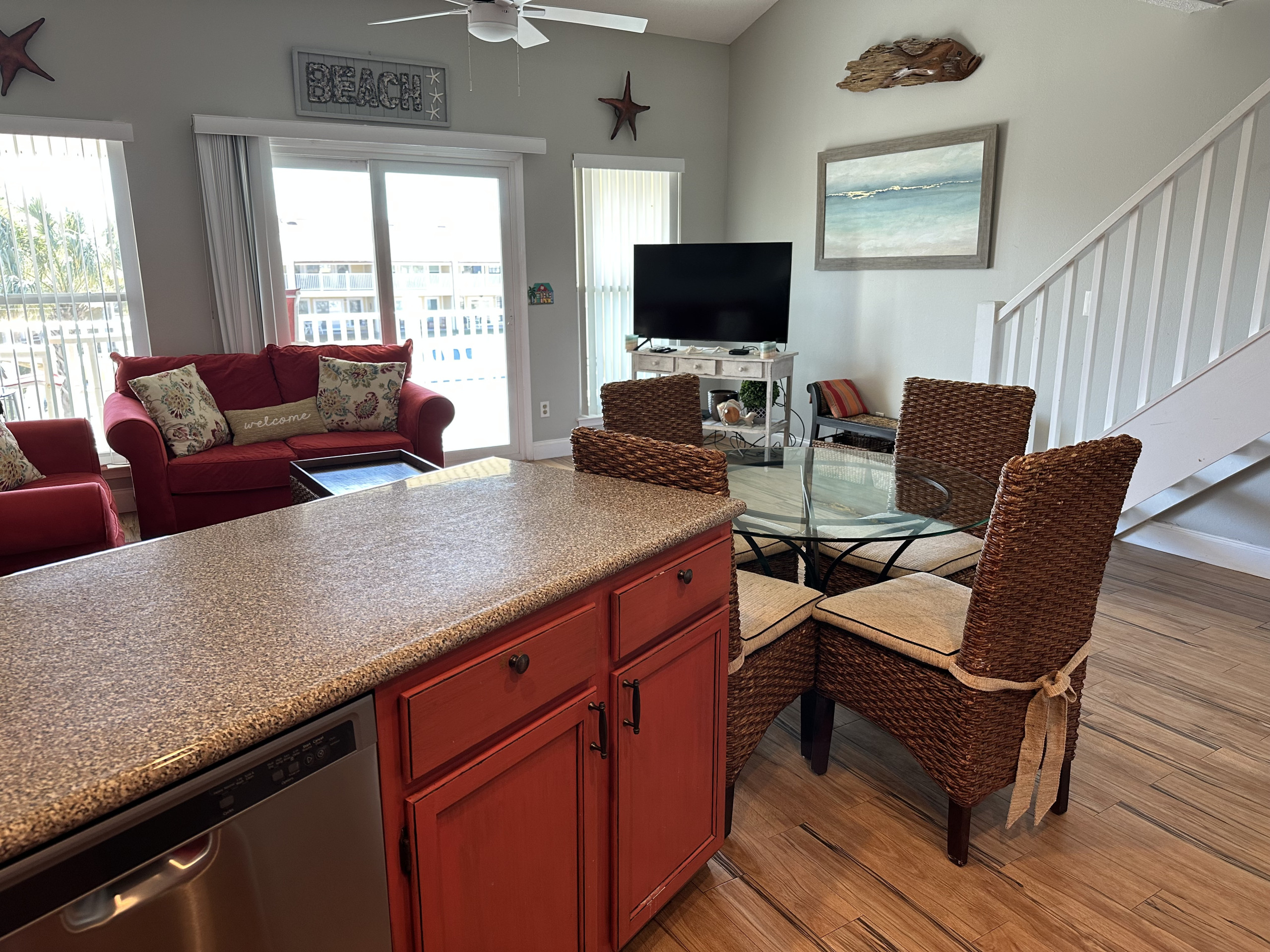 The charming and open 9B vacation condo in Destin offers its guests a first floor unit with one bedroom and a private bath. The condo can sleep six with a King-sized bed in the master bedroom, a Queen-sized sleeper sofa in the main room, and bunk beds in the hall. Make use of the fully-equipped, well stocked kitchen with its stove, microwave, fridge, and dishwasher. The kitchen has seating at the bar and a table for four. The unit is tastefully decorated with modern décor and appliances, including a washer and dryer. There are plenty of hooks for hanging wet beach towels and bathing suits to dry. Lots of detail has been put into this unit to make sure you have a comfortable stay. Connect to the complimentary wireless Internet or catch up on shows with the cable HDTVs in the main room and bedroom. The condo has a private and furnished patio that overlooks the courtyard and the seasonally heated pool as well as two reserved parking spaces. All of our units at Seacove are smoke-free and pet-free and offer unparalleled amenities with our pool, proximity to restaurants, grocery stores, and shops, and our own private beach access. Book 9B for your Destin vacation! -