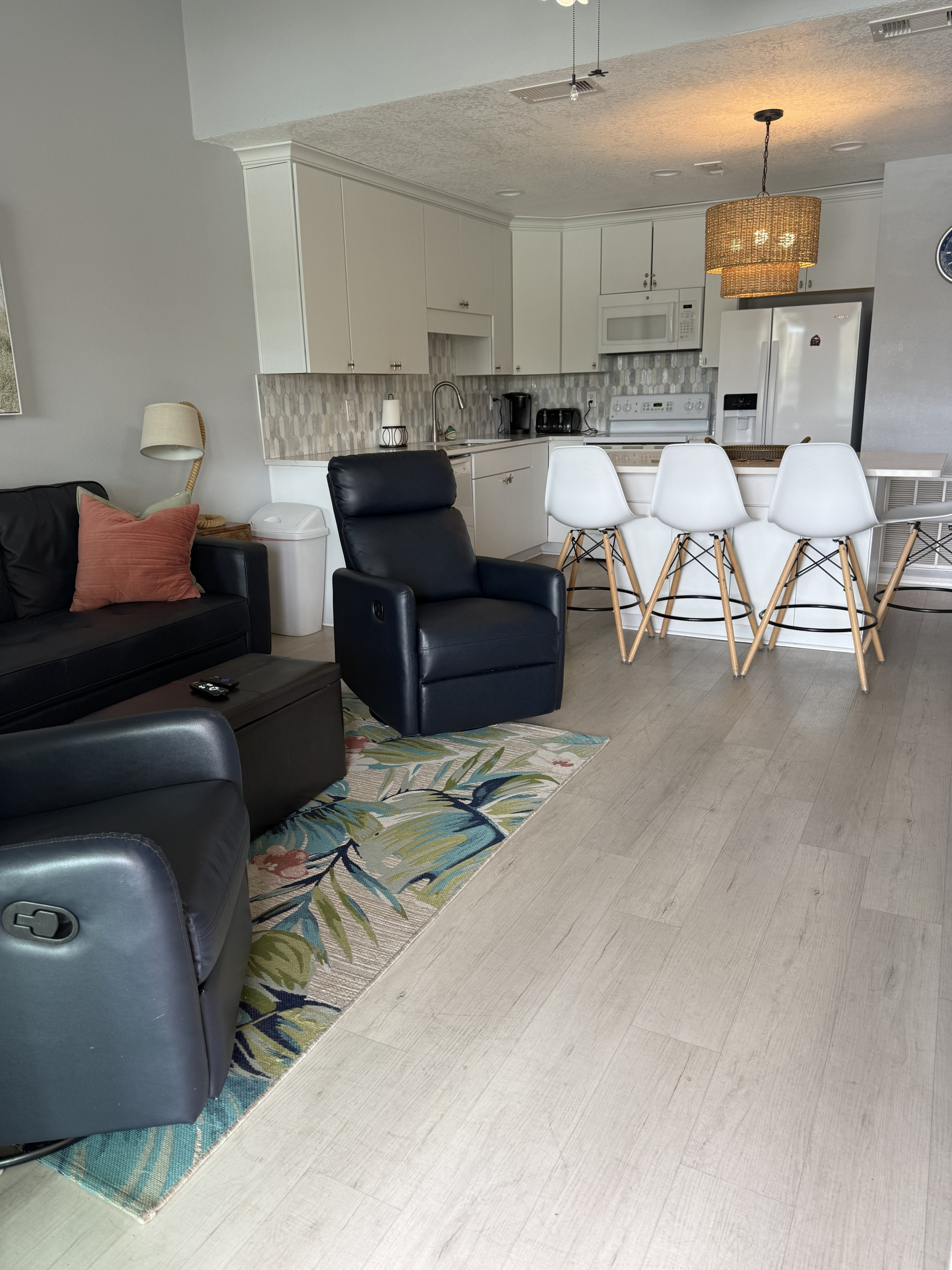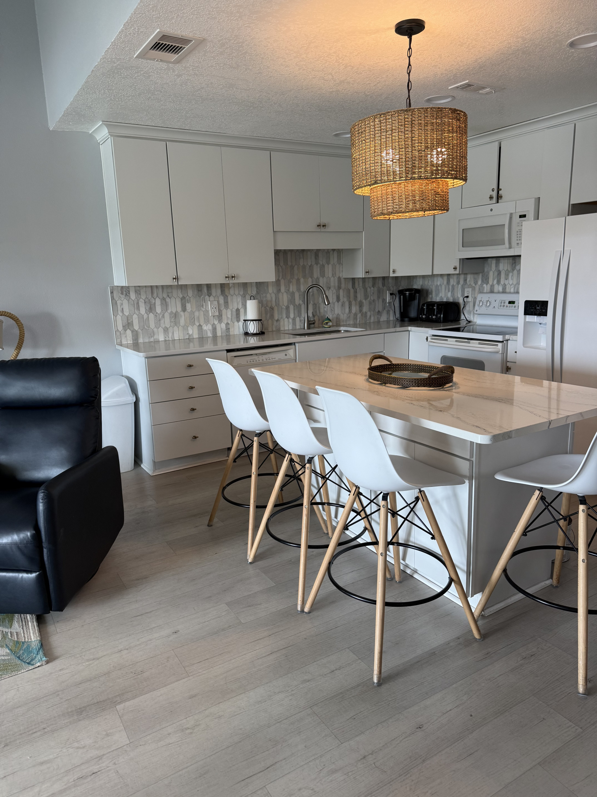 The open kitchen/living room is brightly decorated with new cupboards and white quartz countertops and is fully stocked for those wanting to prepare their meals, including a Keurig coffee maker.