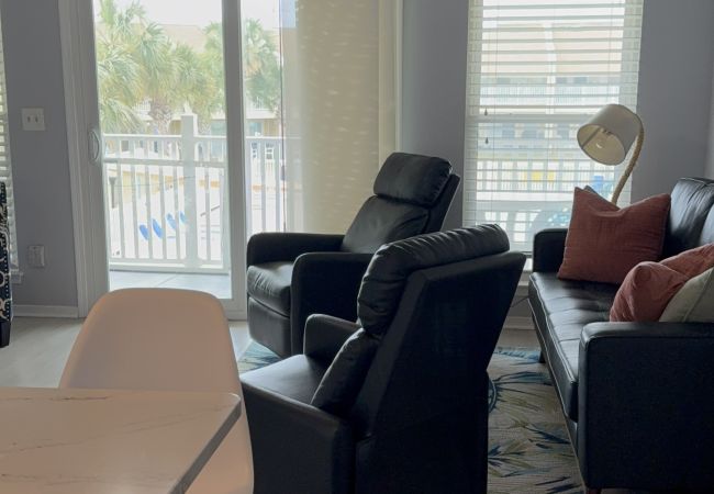The living space has a large chaise sofa for an extra sleeping spot. The balcony off the living room is the perfect spot to relax while enjoying your favorite cocktail, overlooking the beautiful zero-entrance swimming pool, which is heated in the winter and cooled during the summer months.