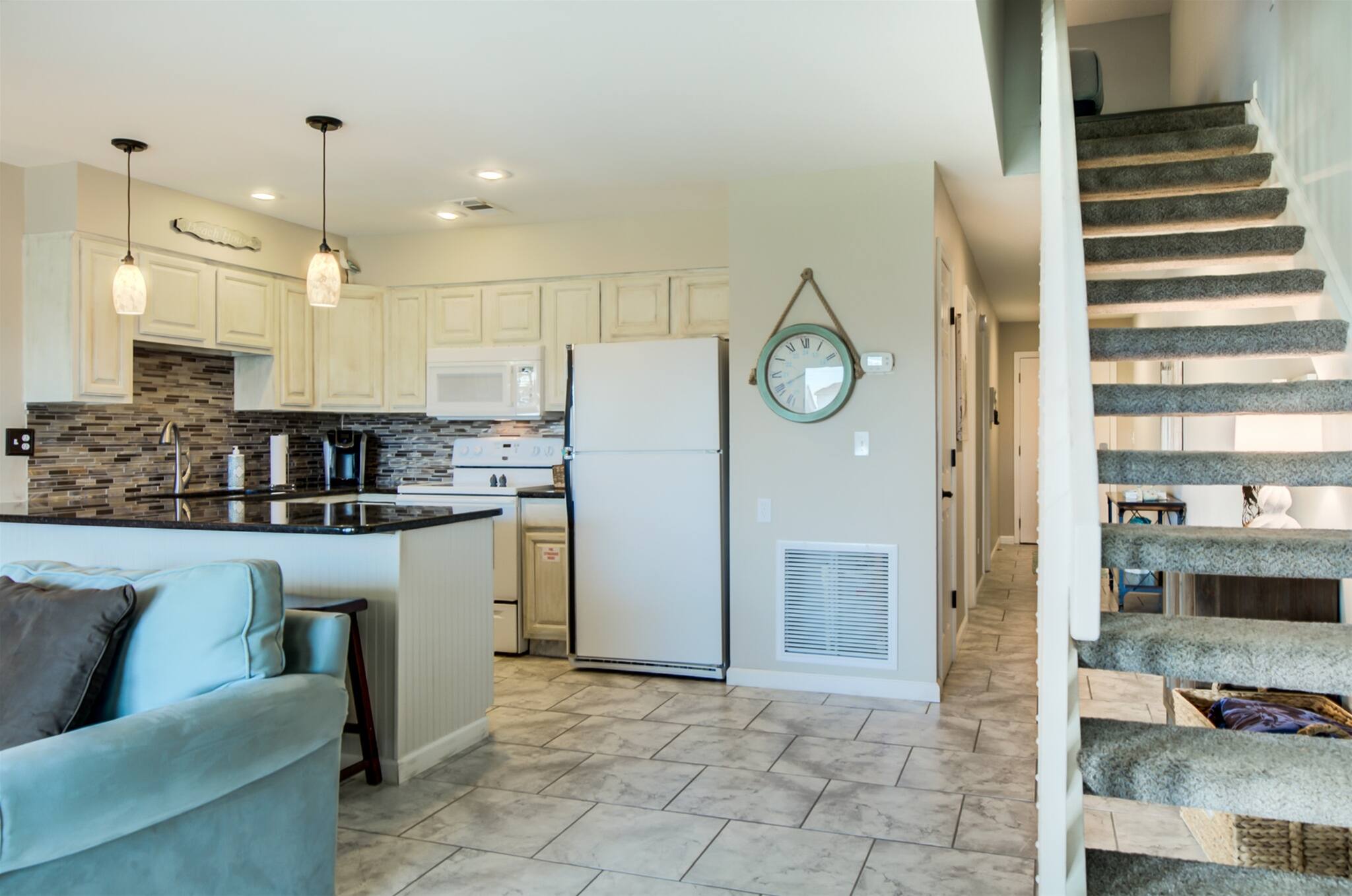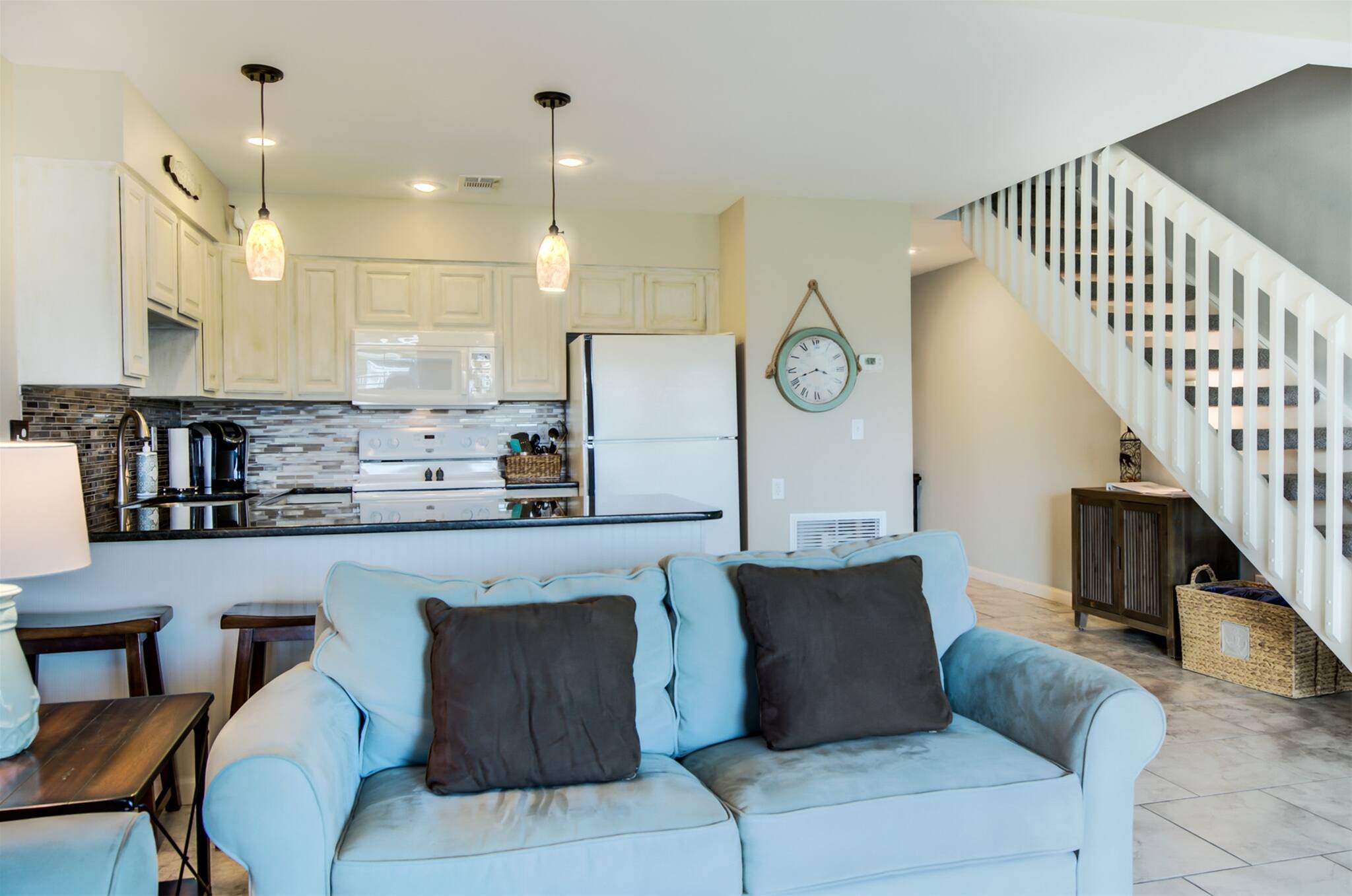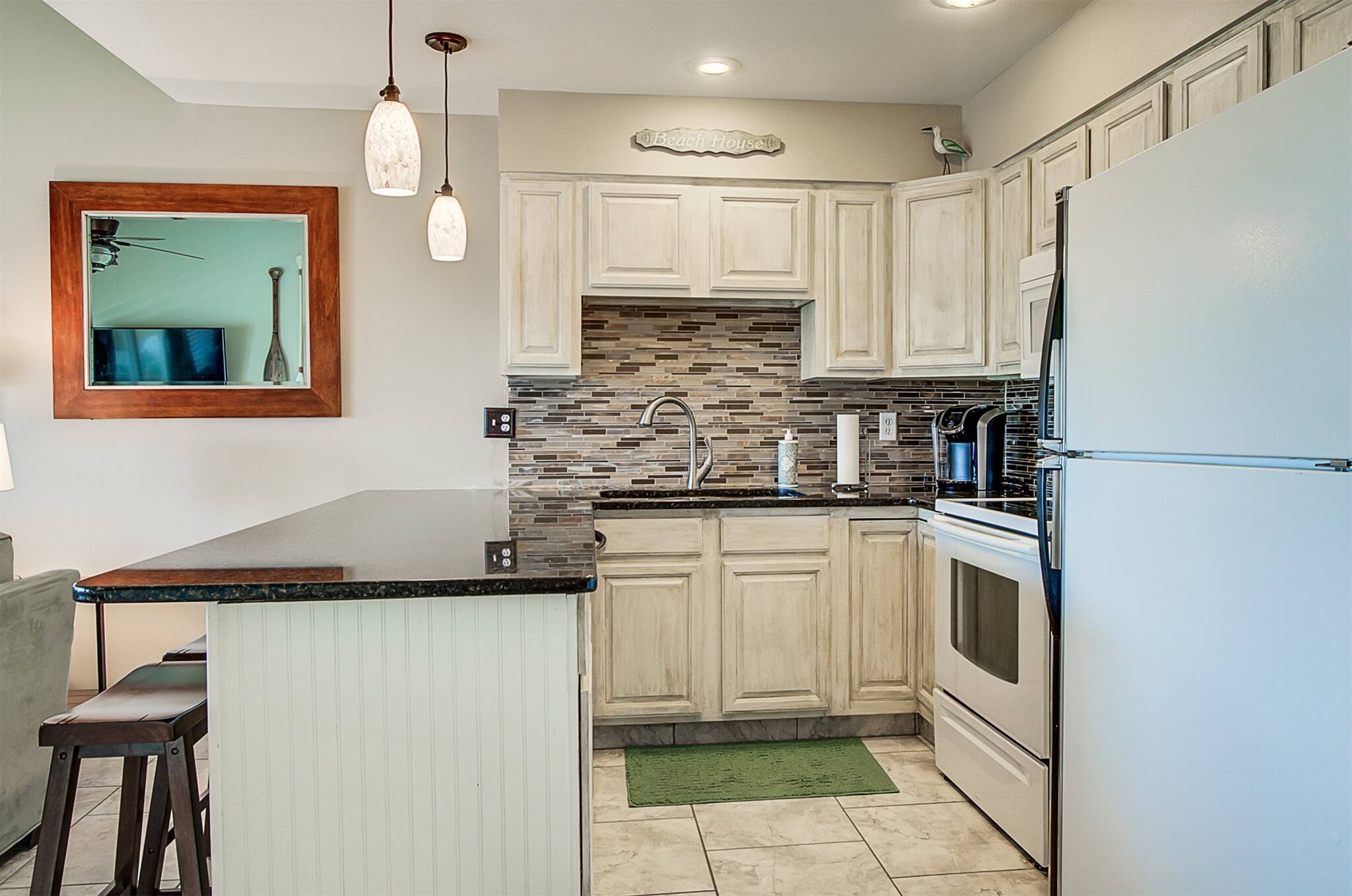 The open kitchen/living room is brightly decorated with new cupboards and white quartz countertops and is fully stocked for those wanting to prepare their meals, including a Keurig coffee maker.