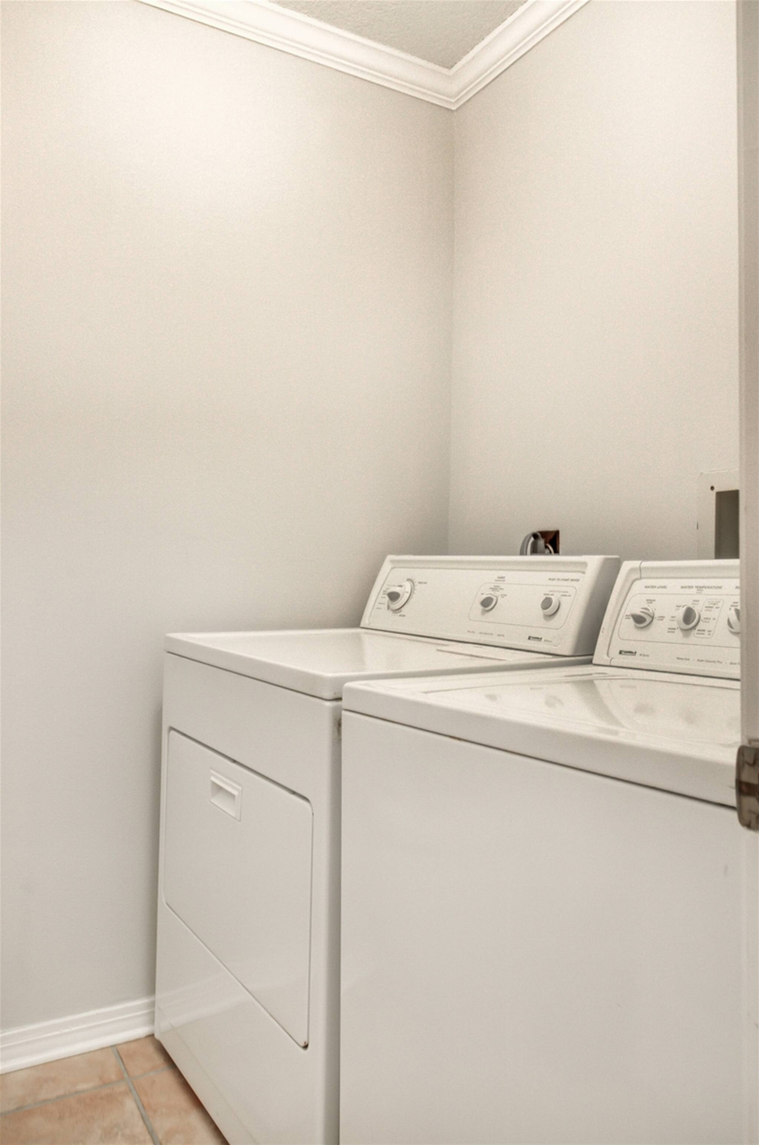 This tropical and light three-bedroom unit spans two stories and includes a rear patio overlooking the pools with a porch swing.